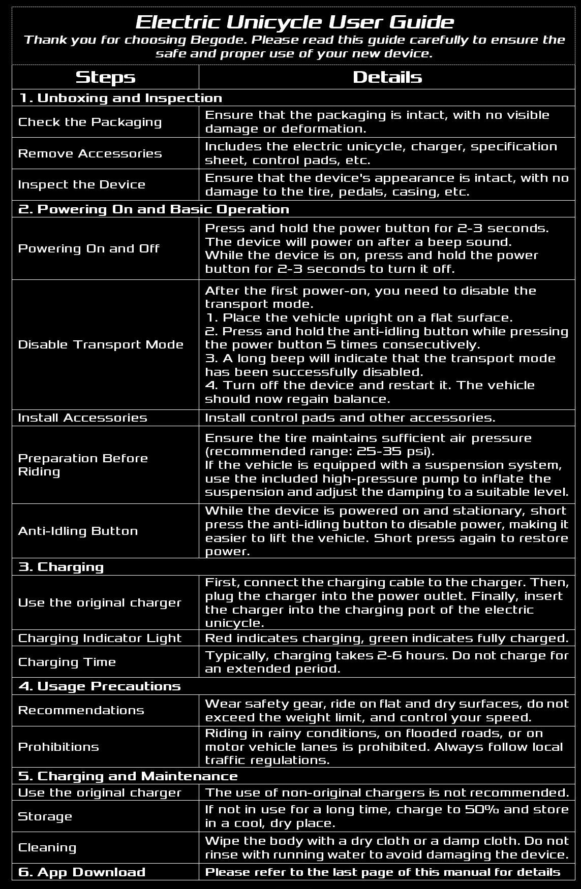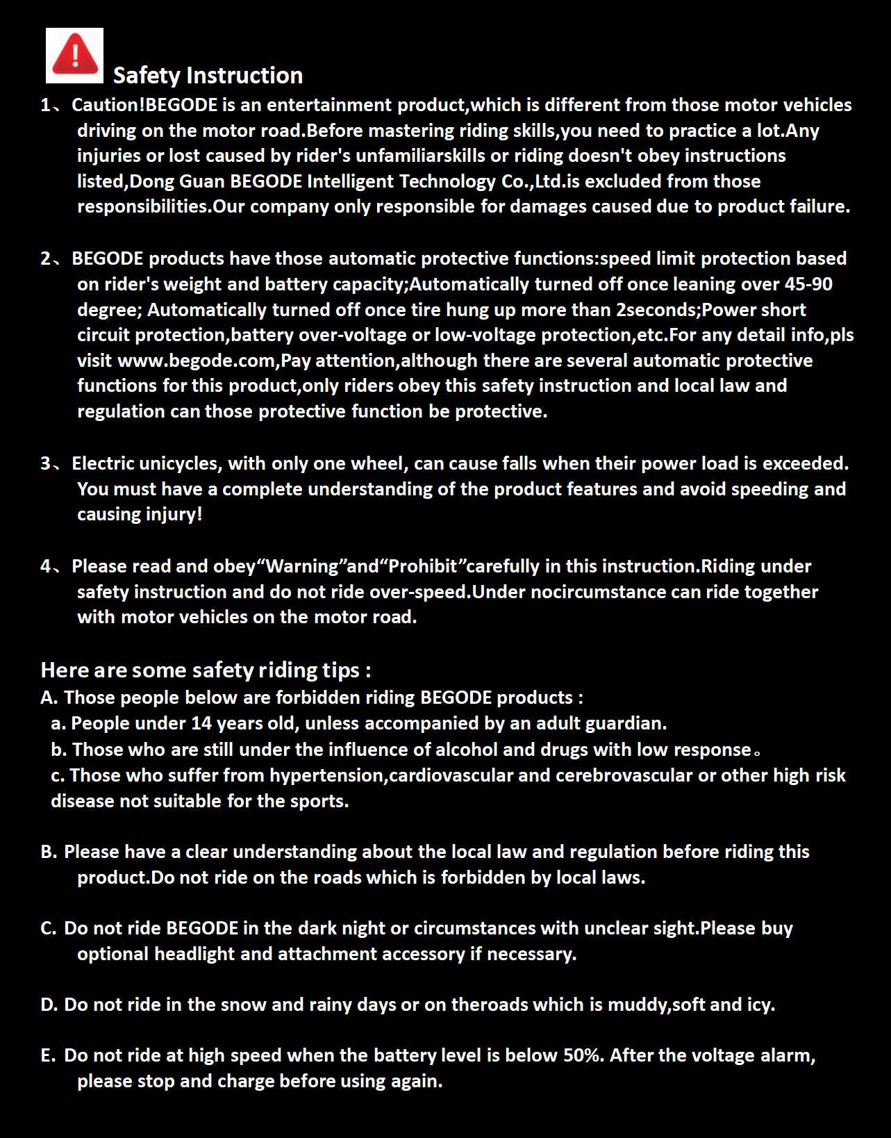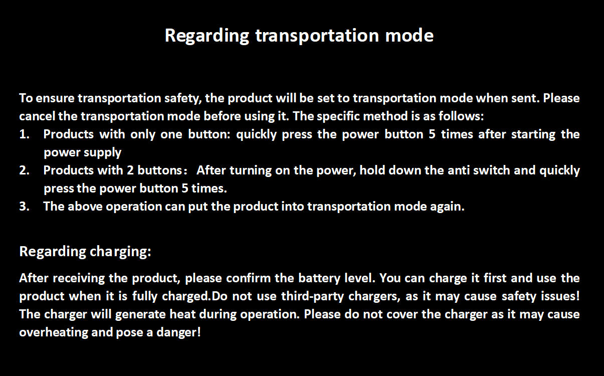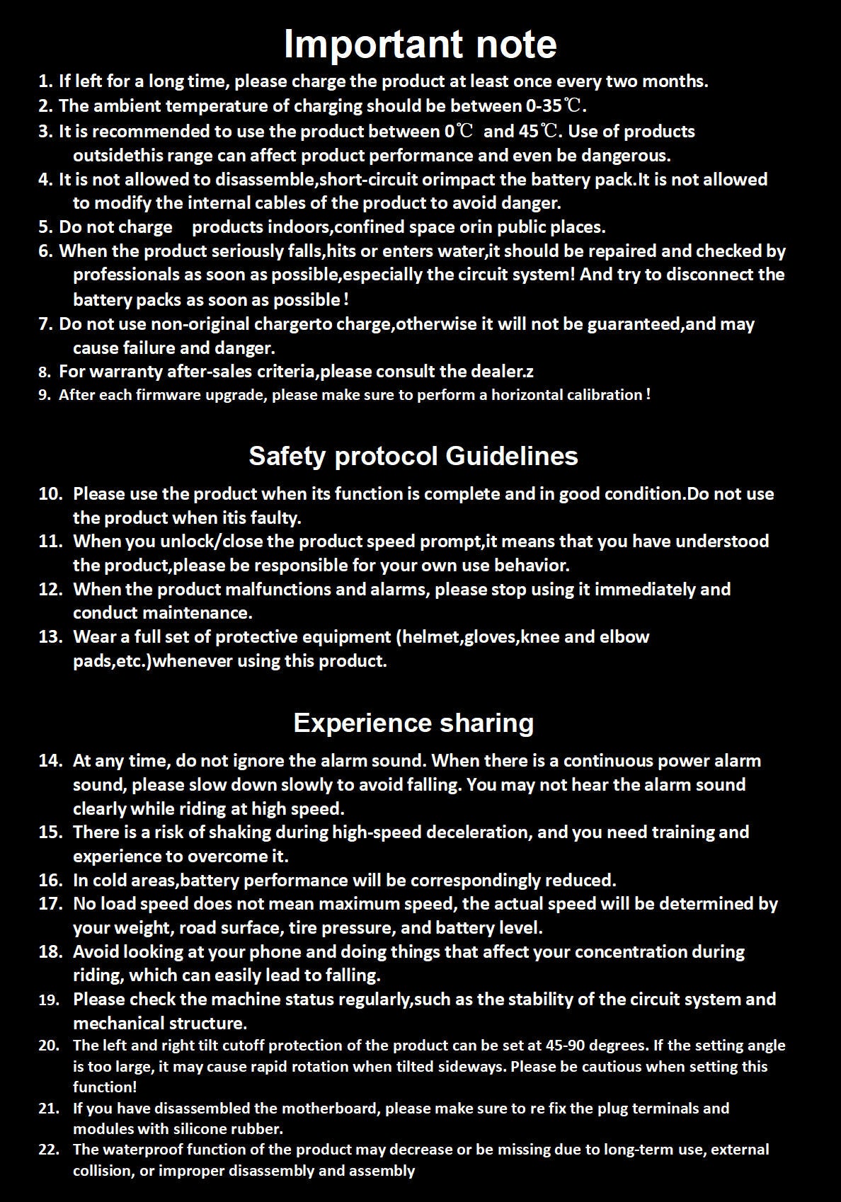 Warranty Period (calculated from the date of receiving the goods): Mainboard, motor, battery: 1 year Shock absorber, lamp parts: 6 months Seat cushion, tire, power pad: 3 months Please read the Manual carefully!